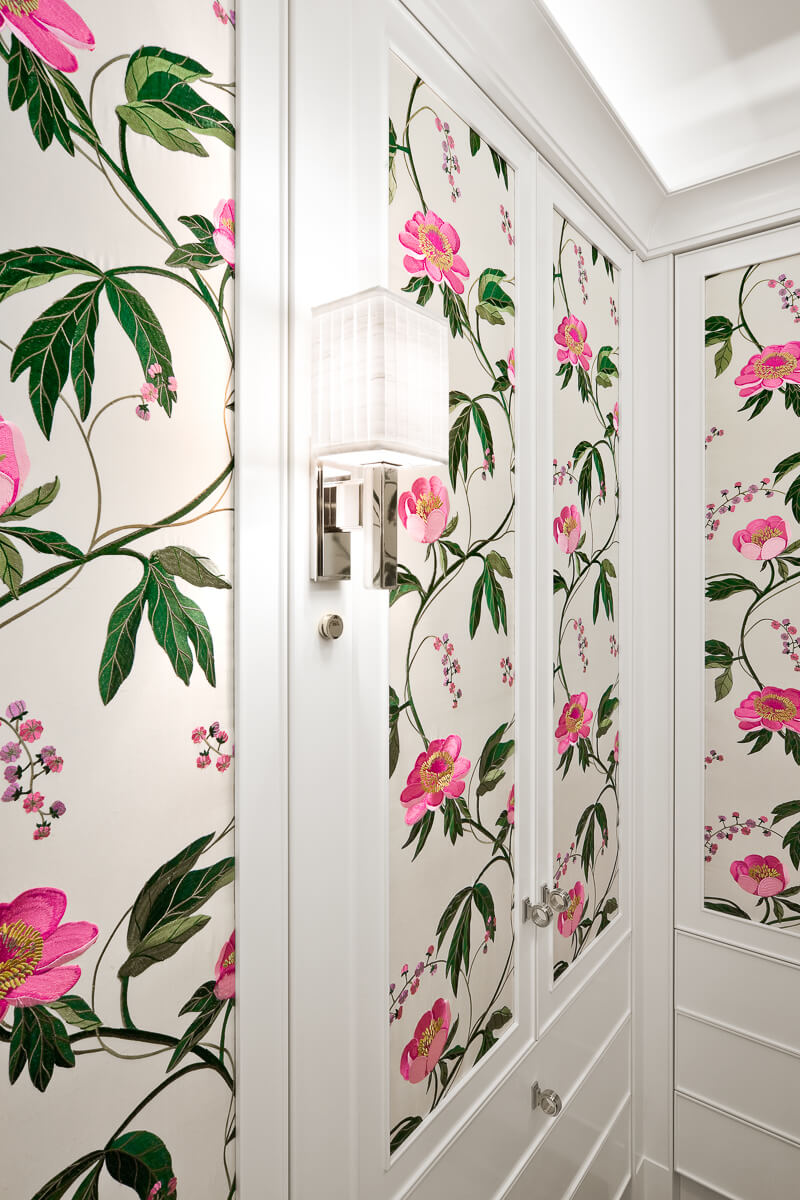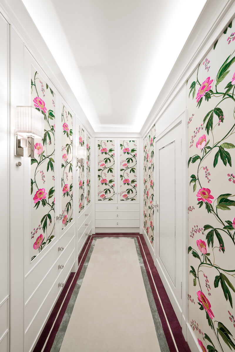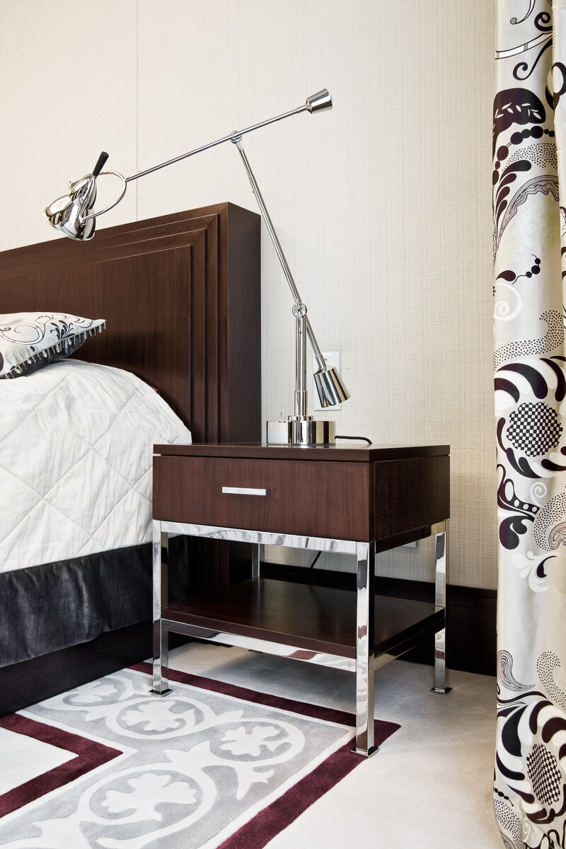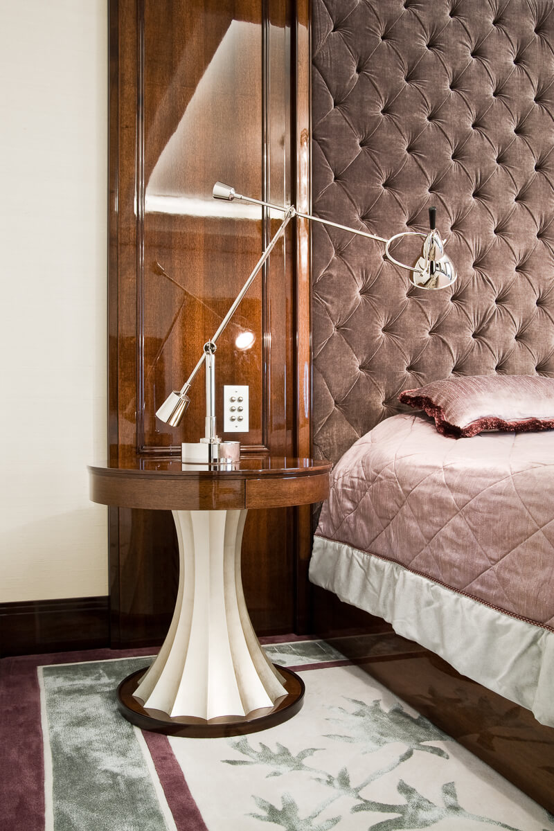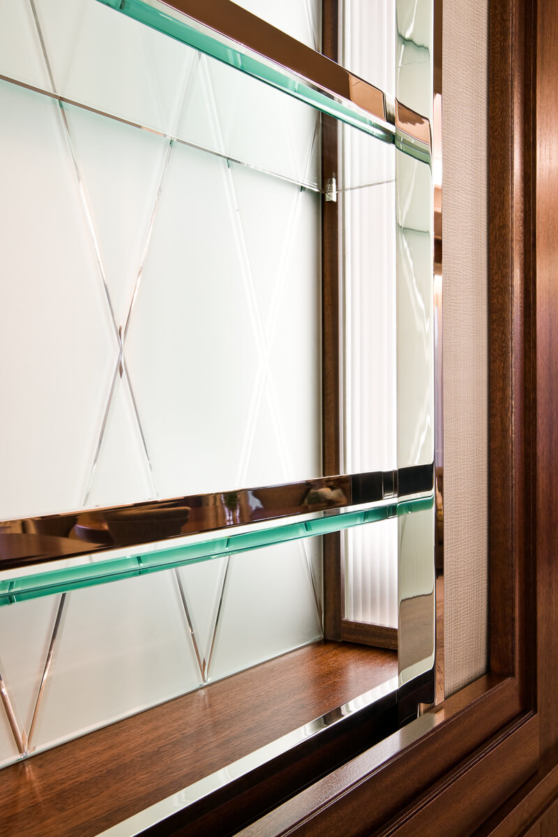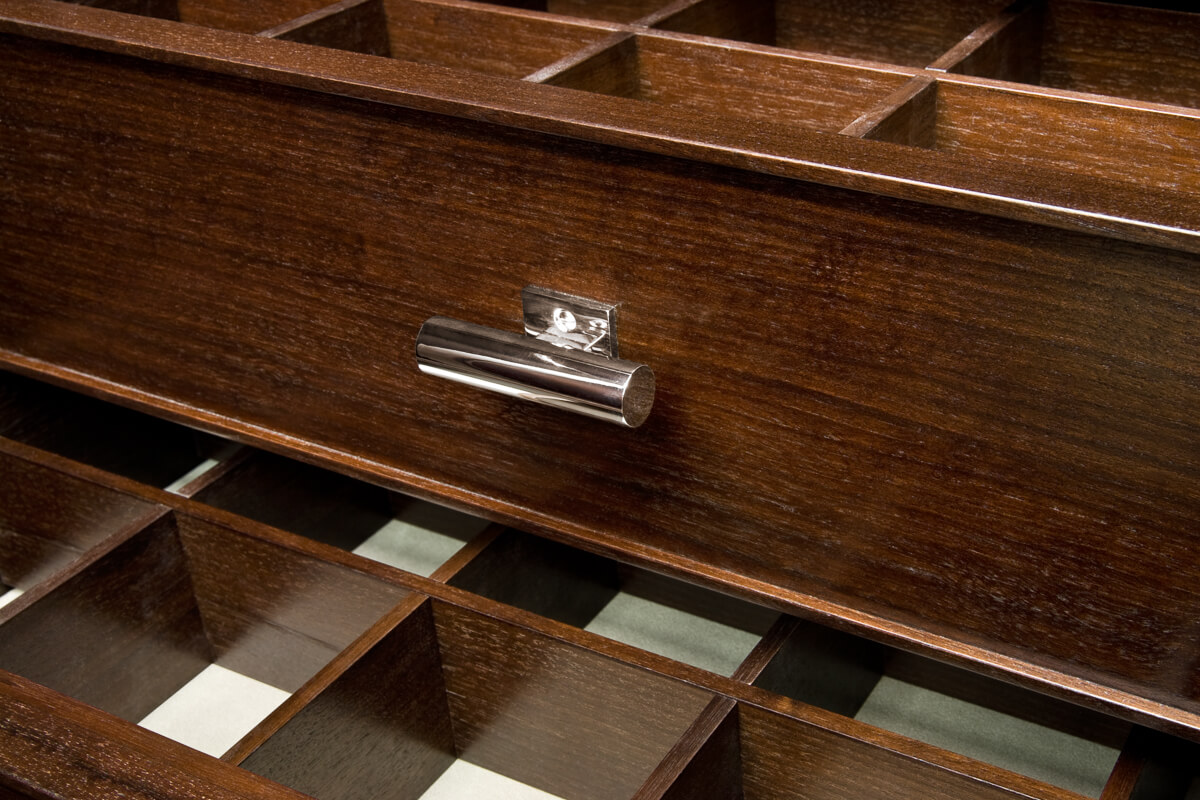Neben der Gesamtgestaltung der Räume, sowie der Fertigung der Einbaumöbel und der Türen, haben wir auch Einzelstücke, Teppiche, Beschläge und Leuchten nach Vorlagen aus den 1930er Jahren gestaltet und weiterentwickelt. Bei den verwendeten Hölzern haben wir uns ebenfalls an dieser Epoche orientiert und vornehmlich Makassar, Nussbaum und Pyramidenmahagoni eingesetzt. Abgerundet haben wir das Ensemble durch die Verwendung von Blattvergoldungen, Galuchat (Rochenhaut), sowie aufwendigen Polsterarbeiten. Als Beschläge kamen vorwiegend vernickelte Sonderanfertigungen zum Einsatz, oder Griffe aus der Kollektion von THG.