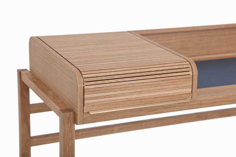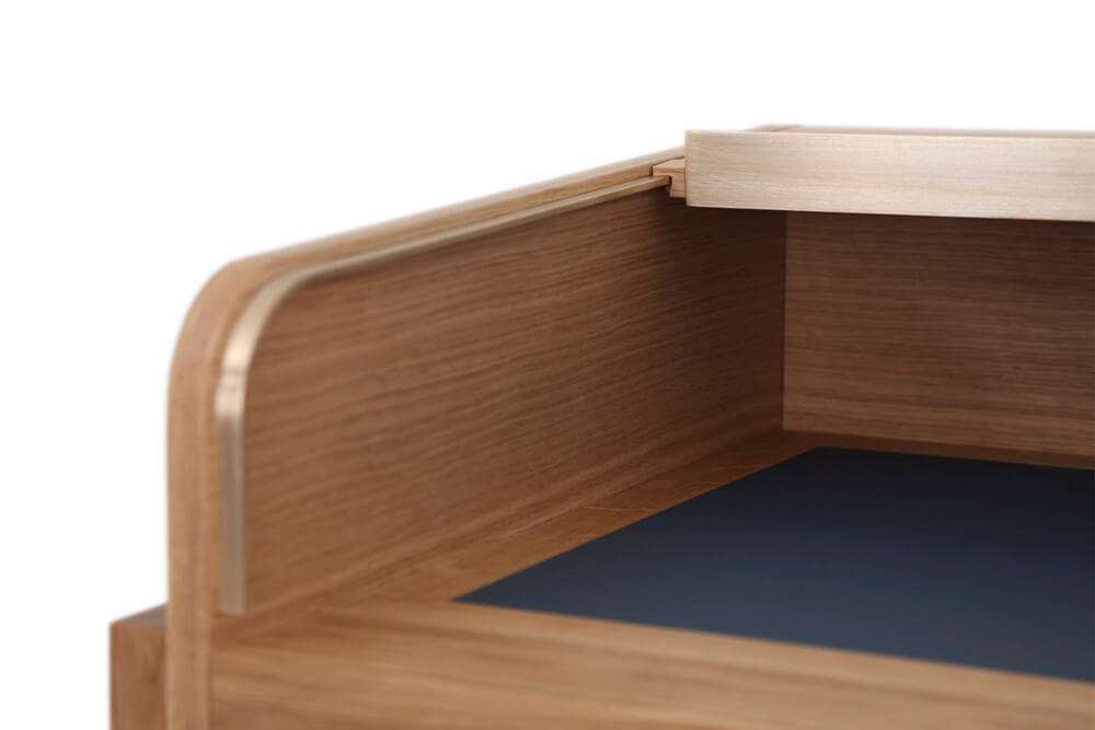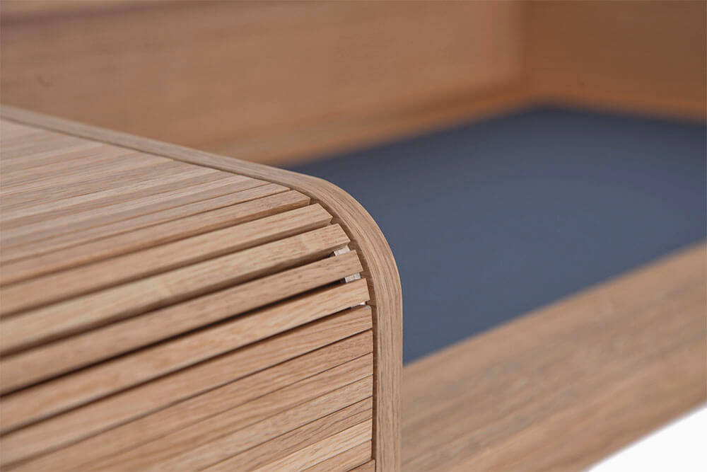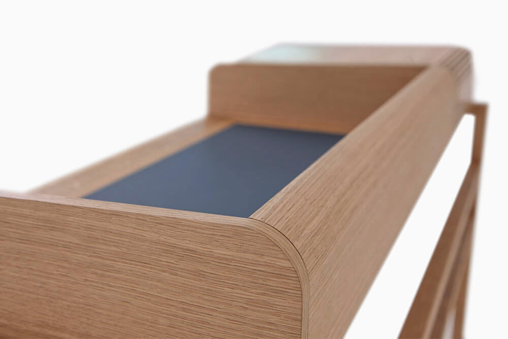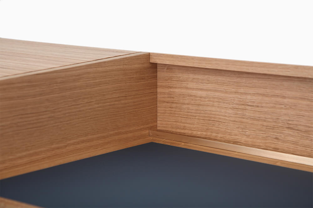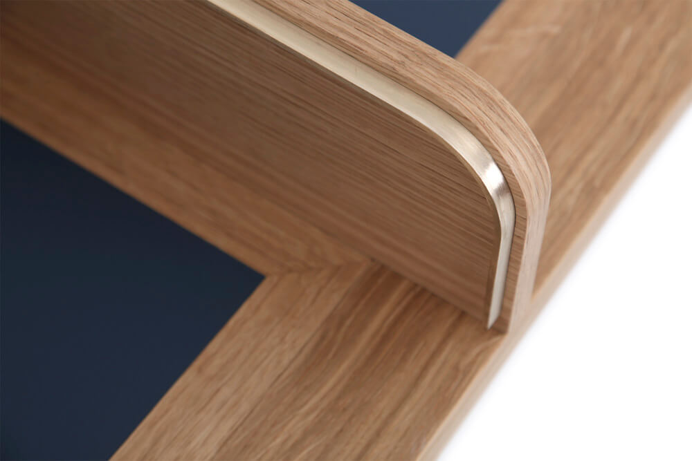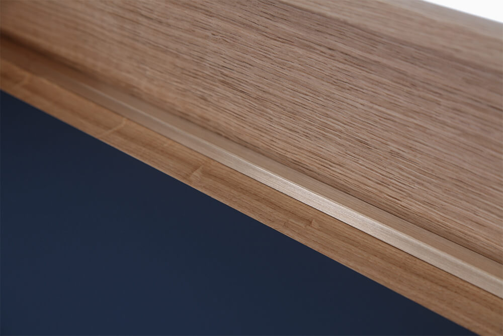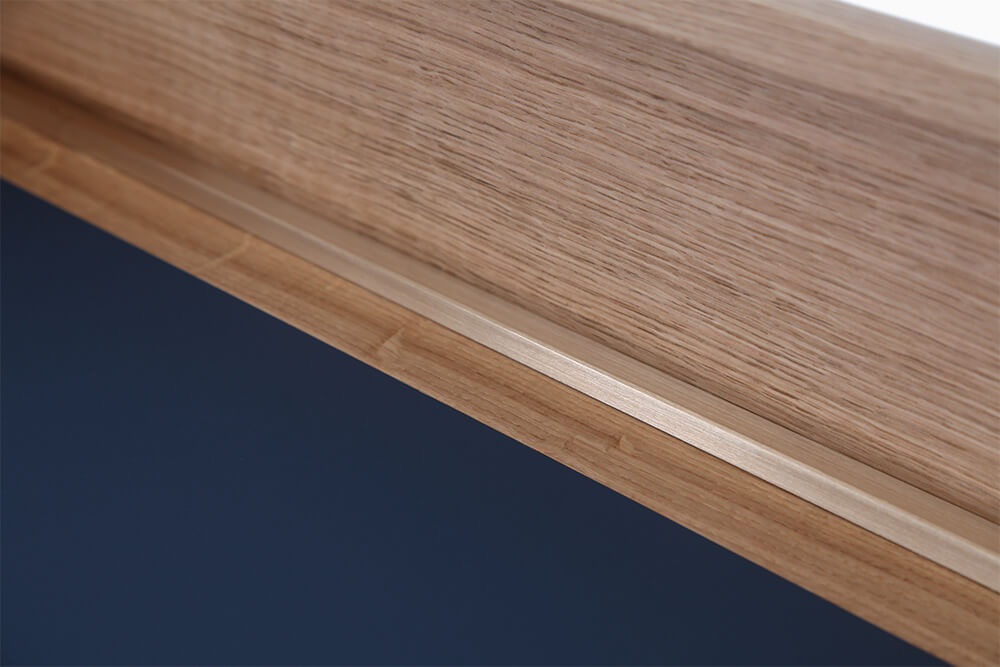 Massiv Eiche furniert, CDF, MDF, Linoleum, Messing gebürstet, Markisenstoff