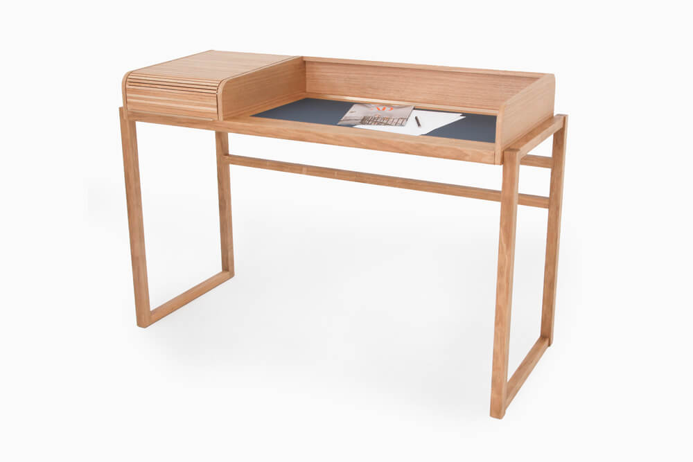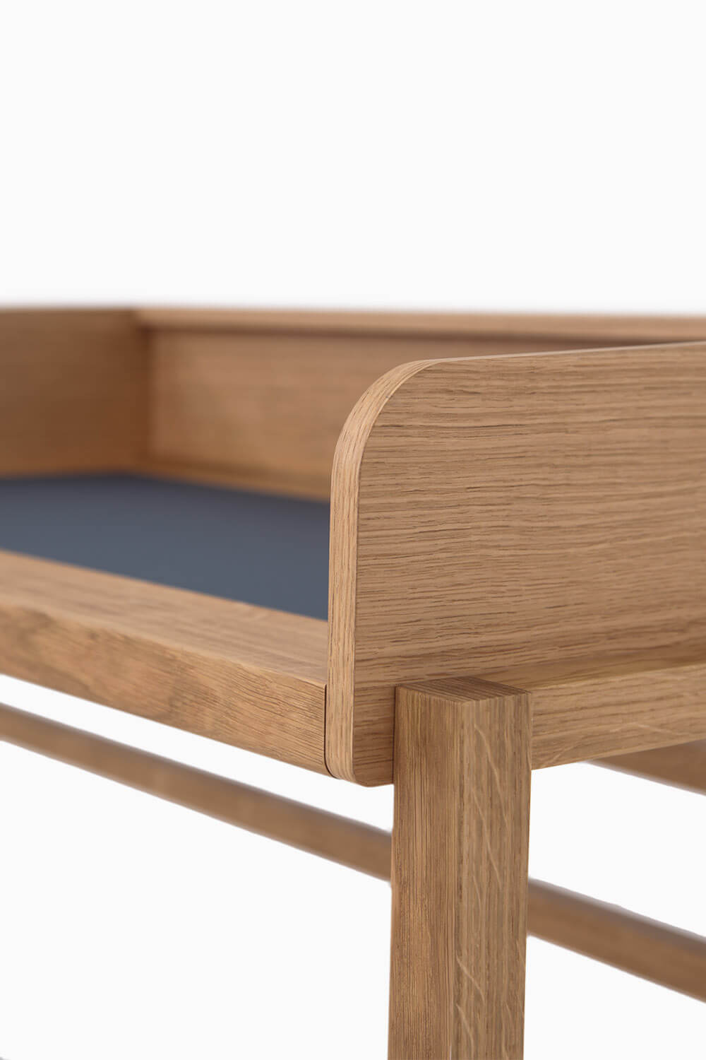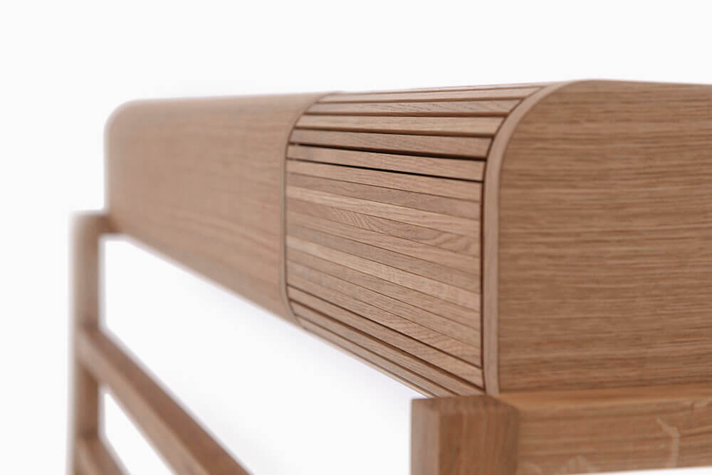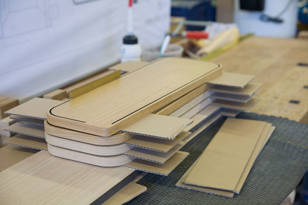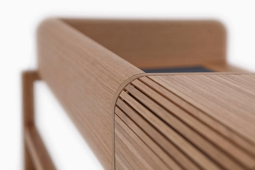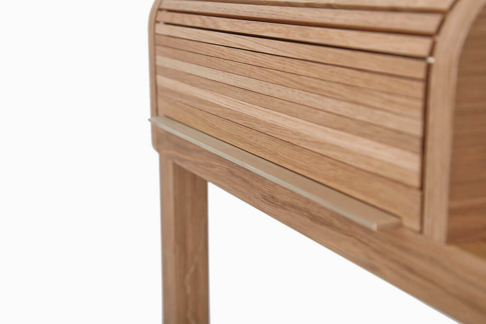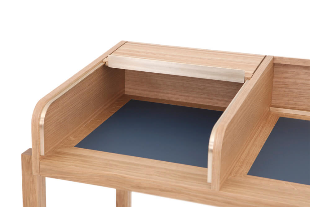 Massiv Eiche furniert, CDF, MDF, Linoleum, Messing gebürstet, Markisenstoff
