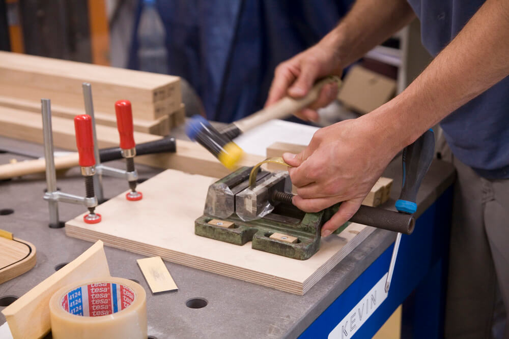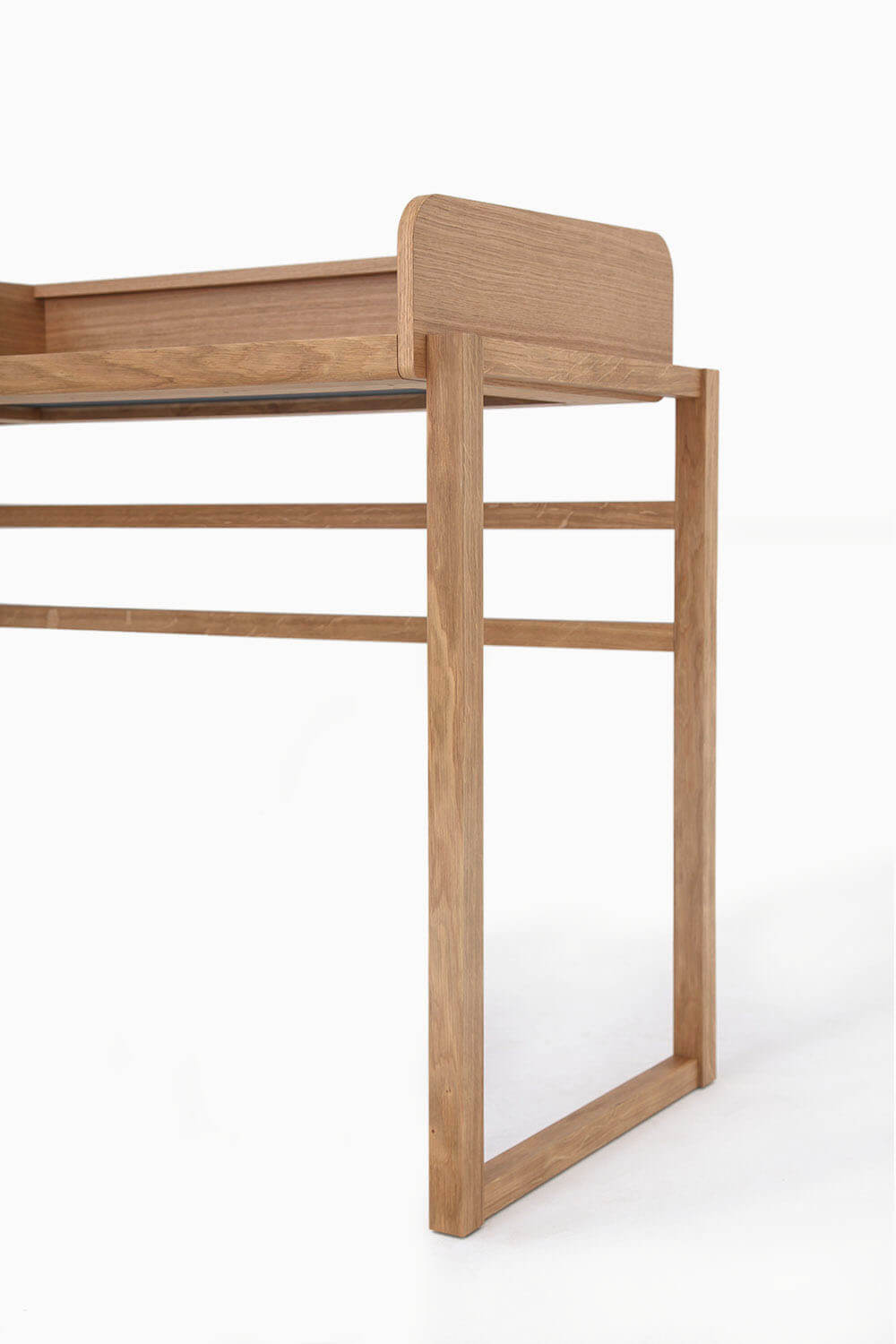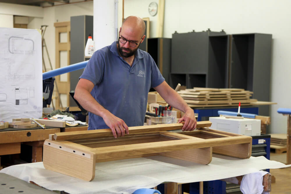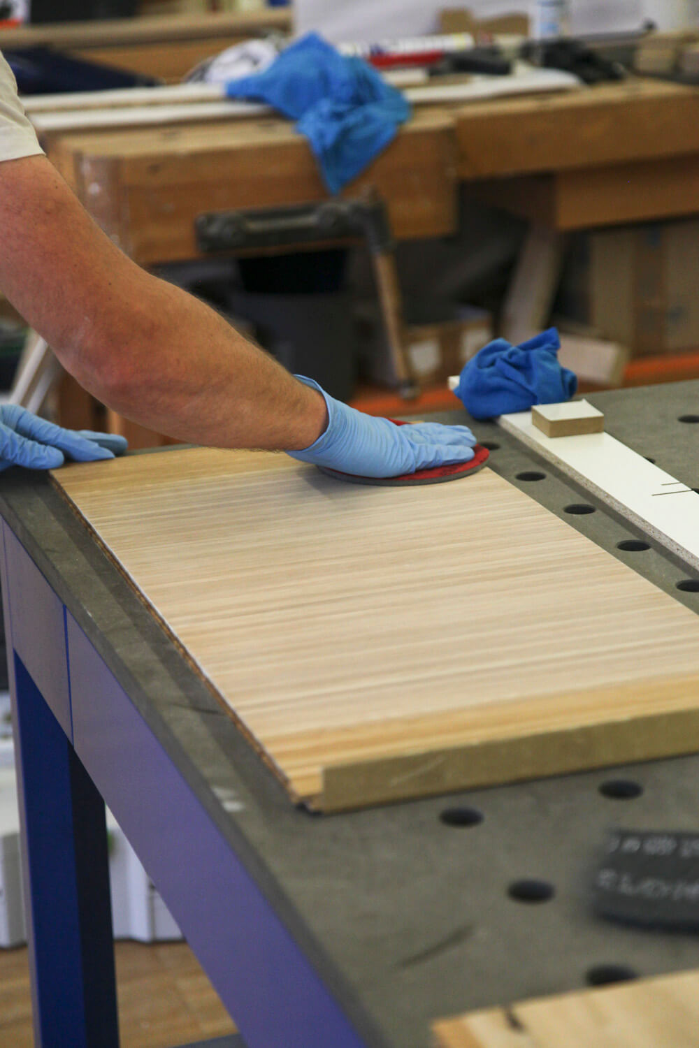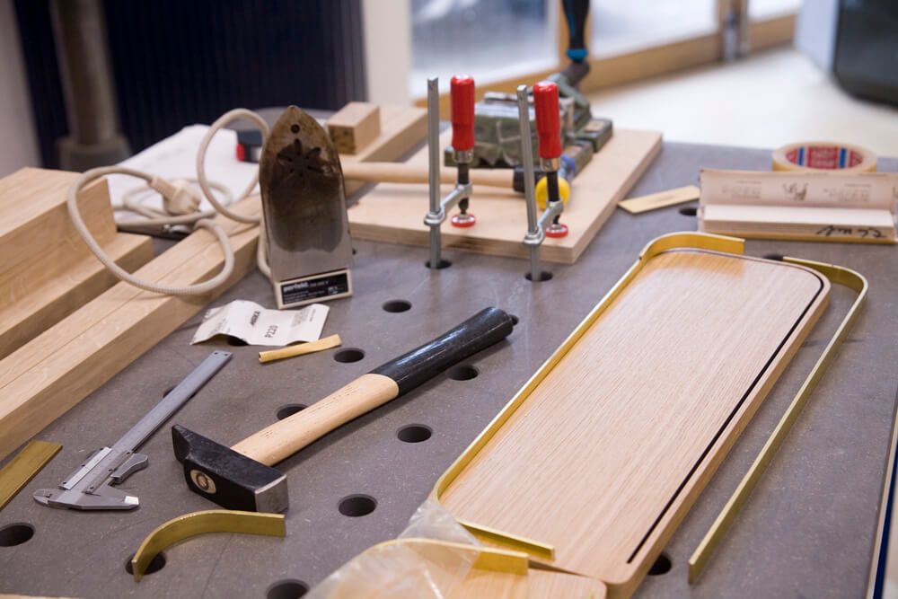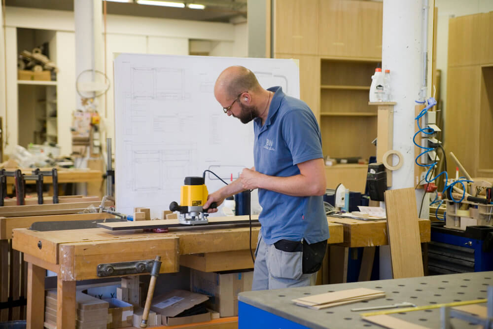 Massiv Eiche furniert, CDF, MDF, Linoleum, Messing gebürstet, Markisenstoff